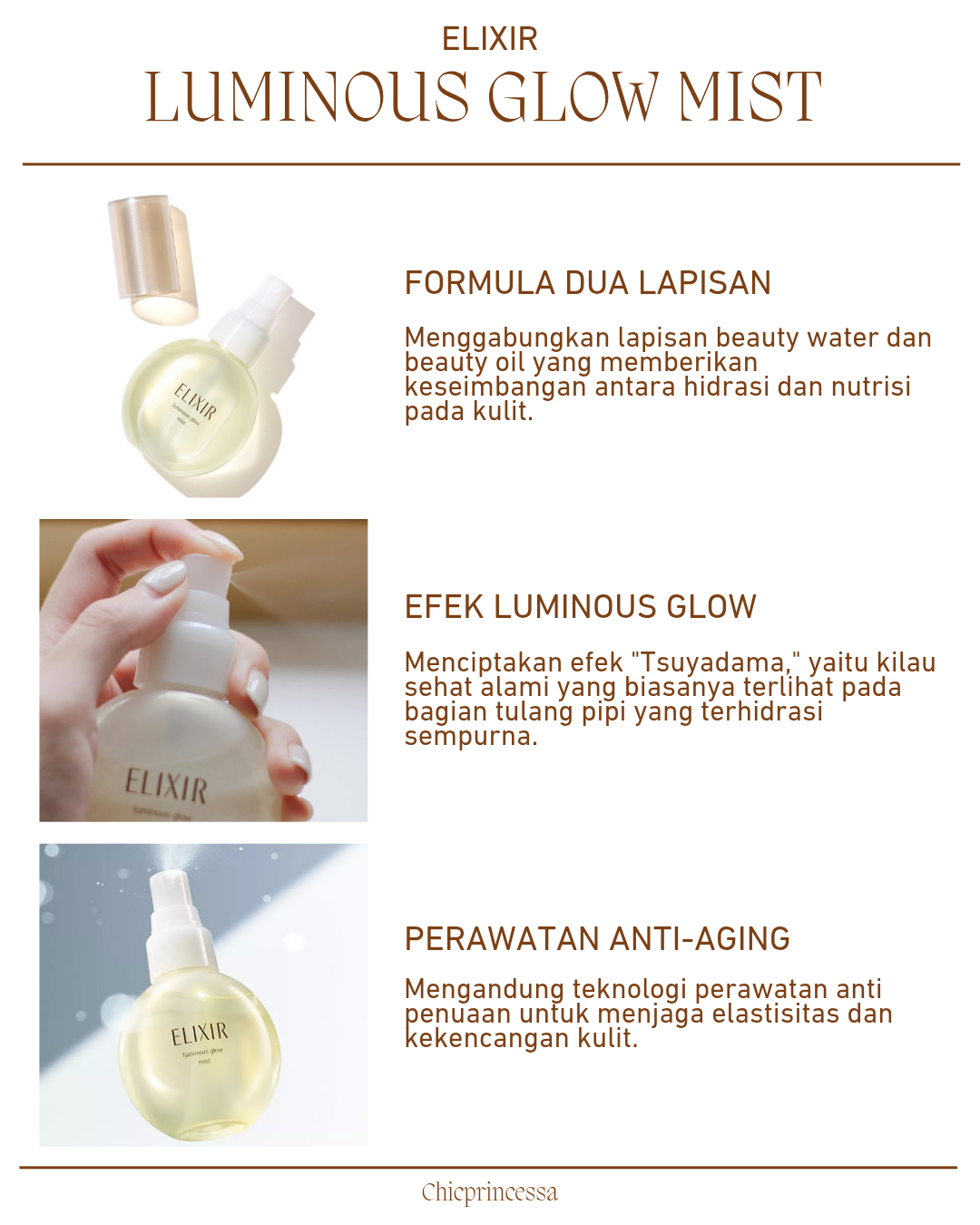 Elixir Luminous Glow Mist adalah semprotan wajah premium dari Jepang yang dirancang untuk memberikan hidrasi instan dan kilau sehat atau "pearl glow" pada kulit.