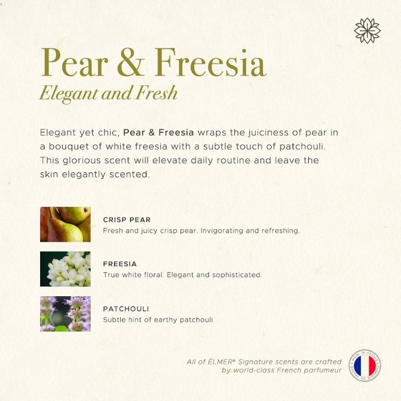 Elegant yet chic, Pear & Freesia wraps the juiciness of pear in a bouquet of white freesia with a subtle touch of patchouli.
