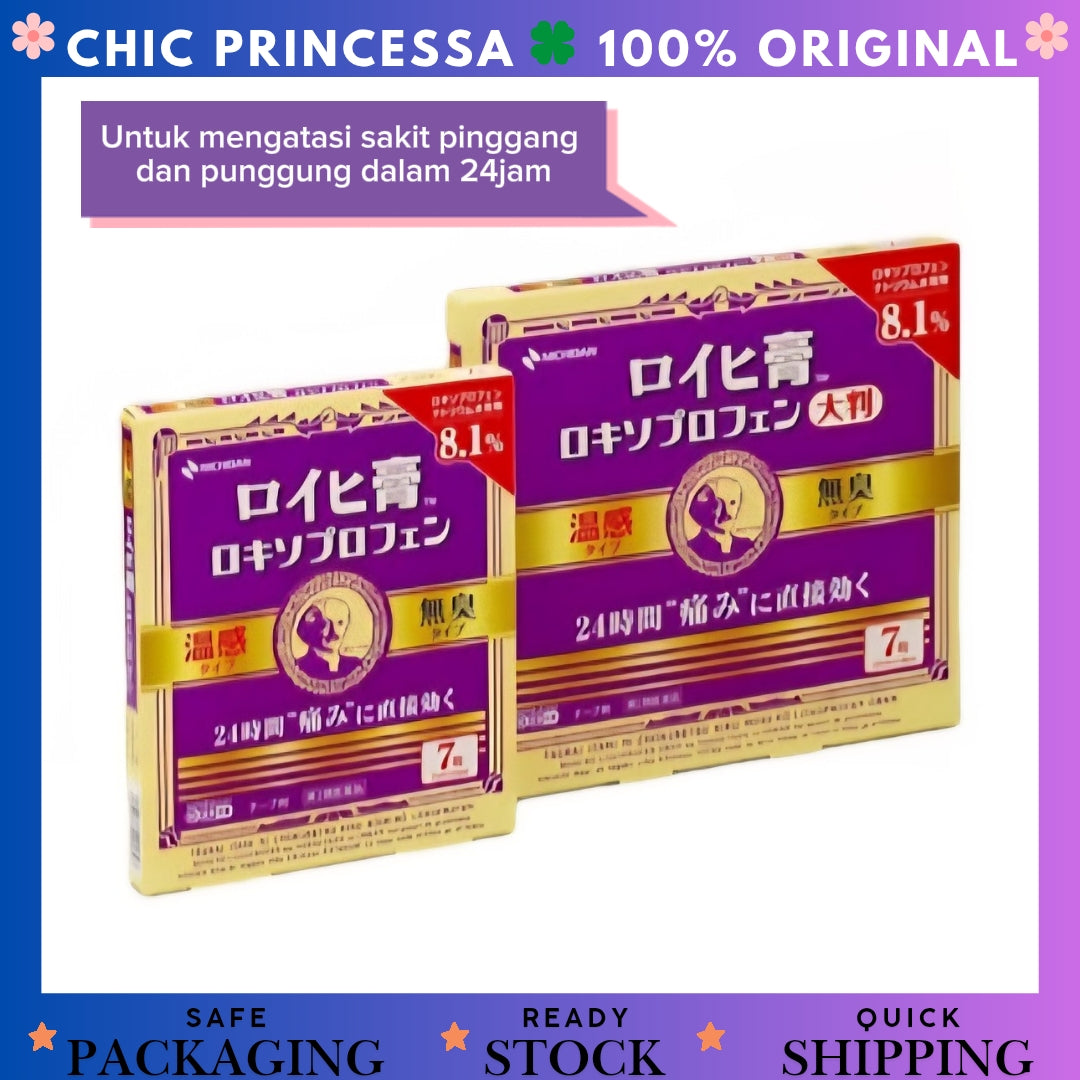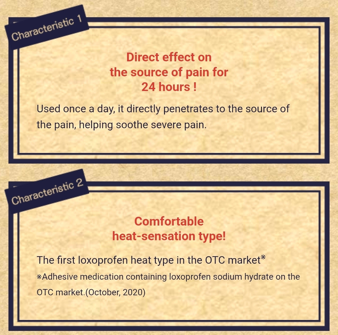 Plester pereda nyeri yang mengandung loxoprofen untuk meredakan nyeri otot, sendi, dan kondisi muskuloskeletal lainnya seperti nyeri punggung, bahu kaku, keseleo, dan memar.